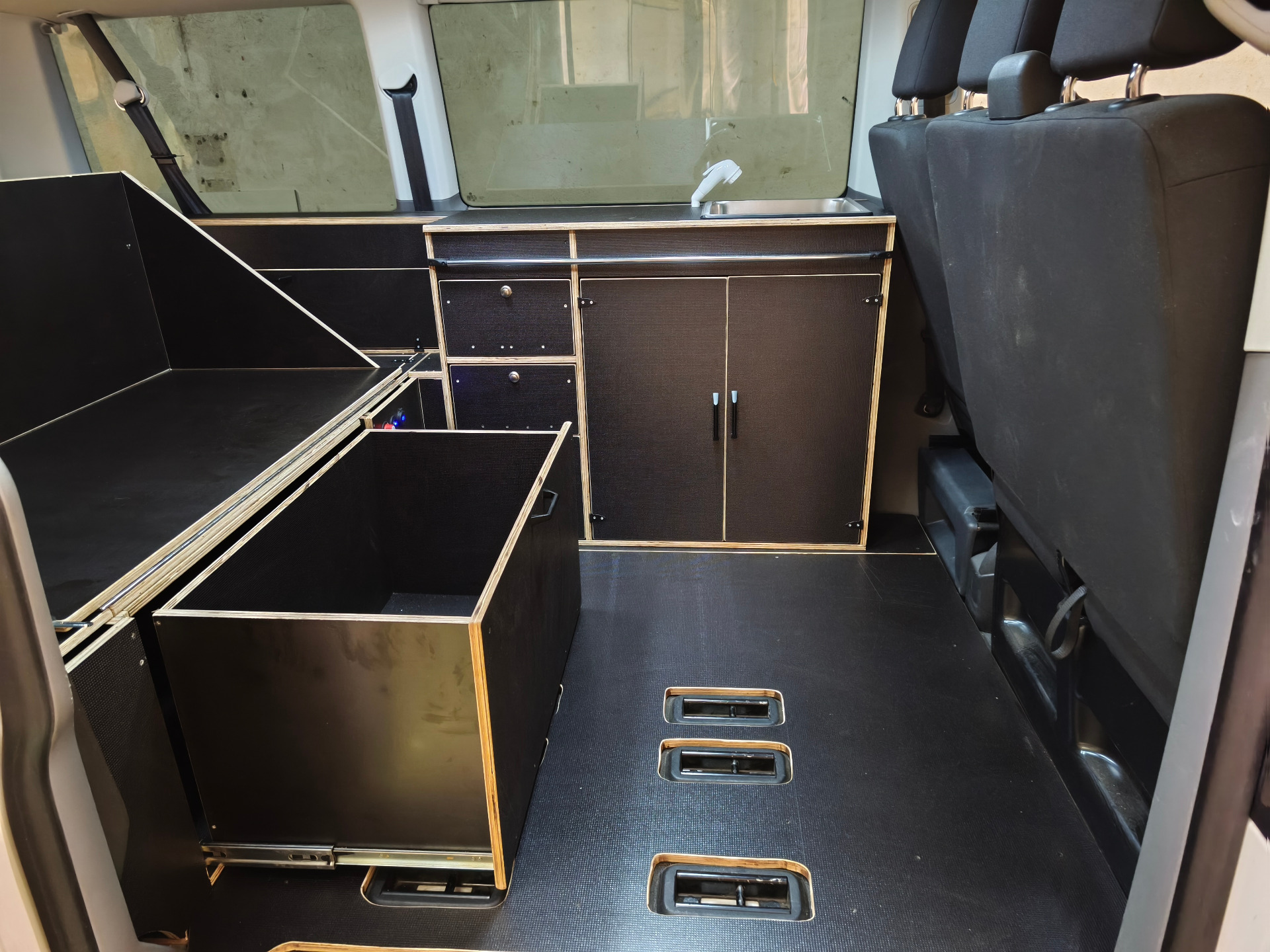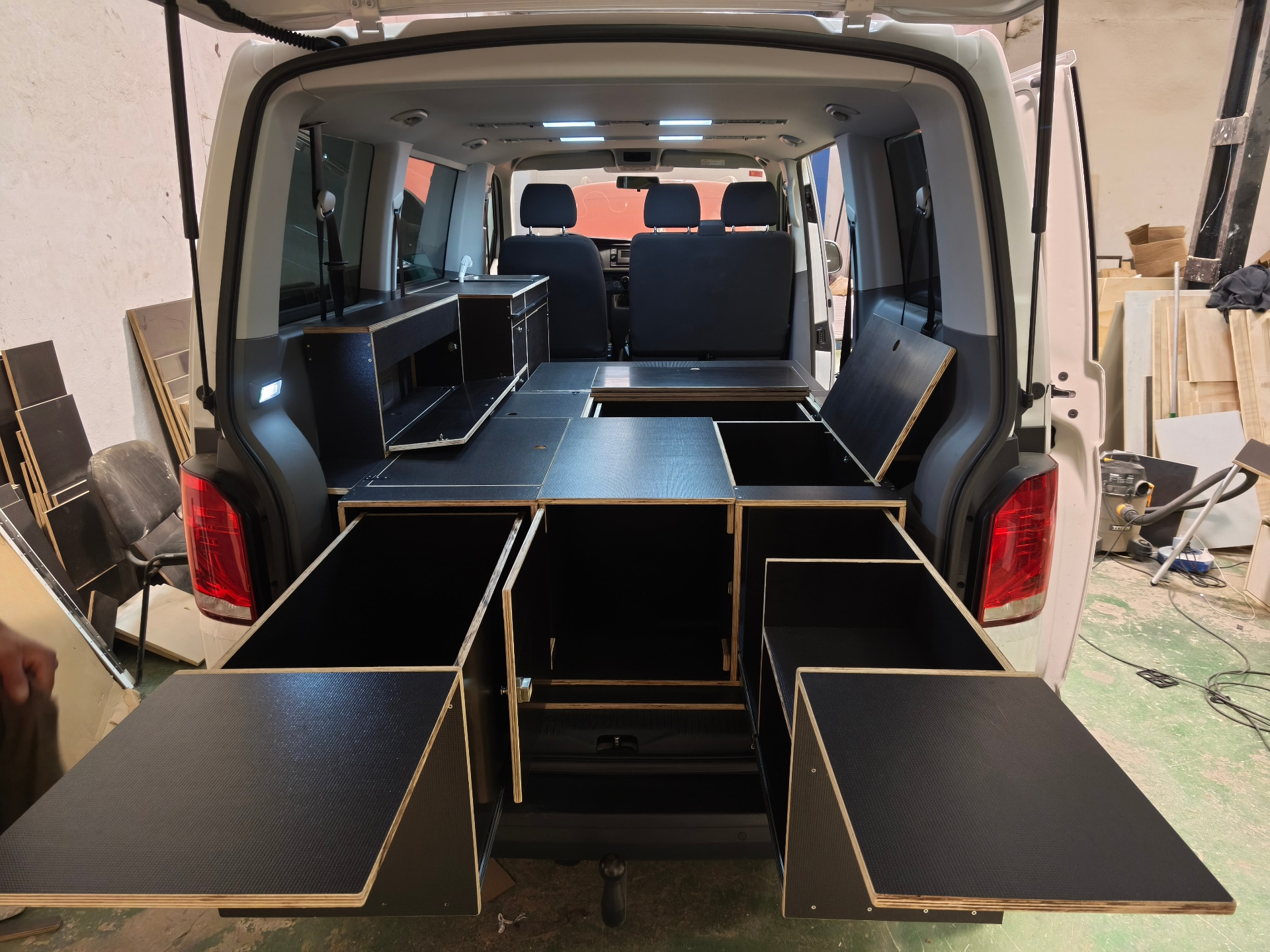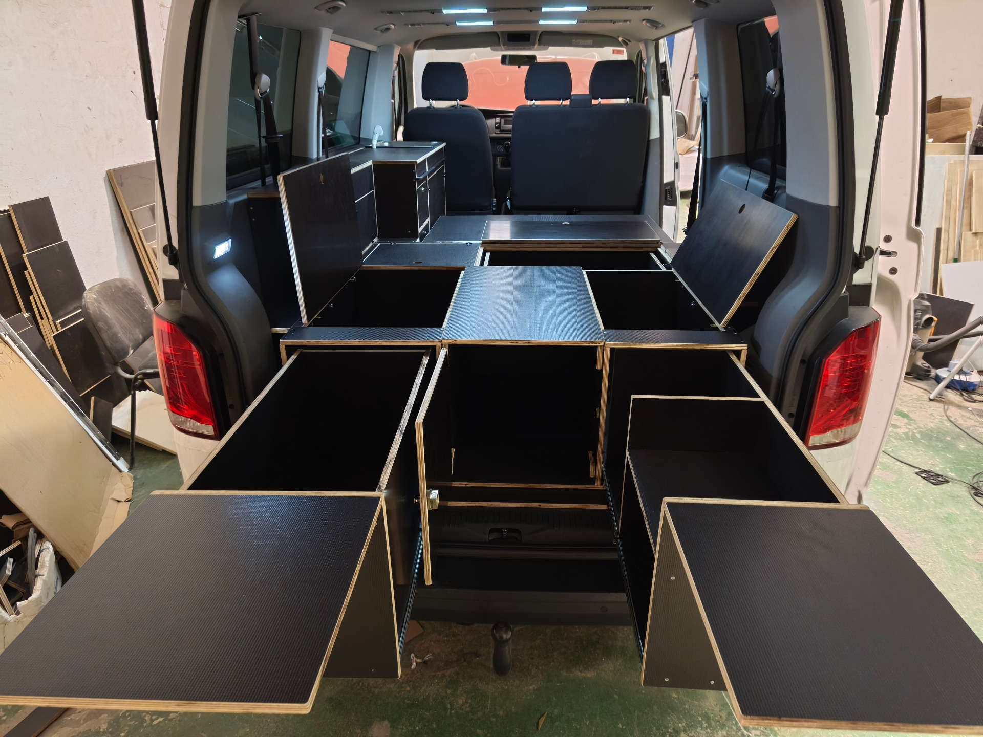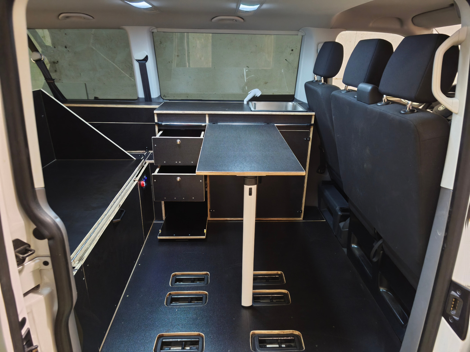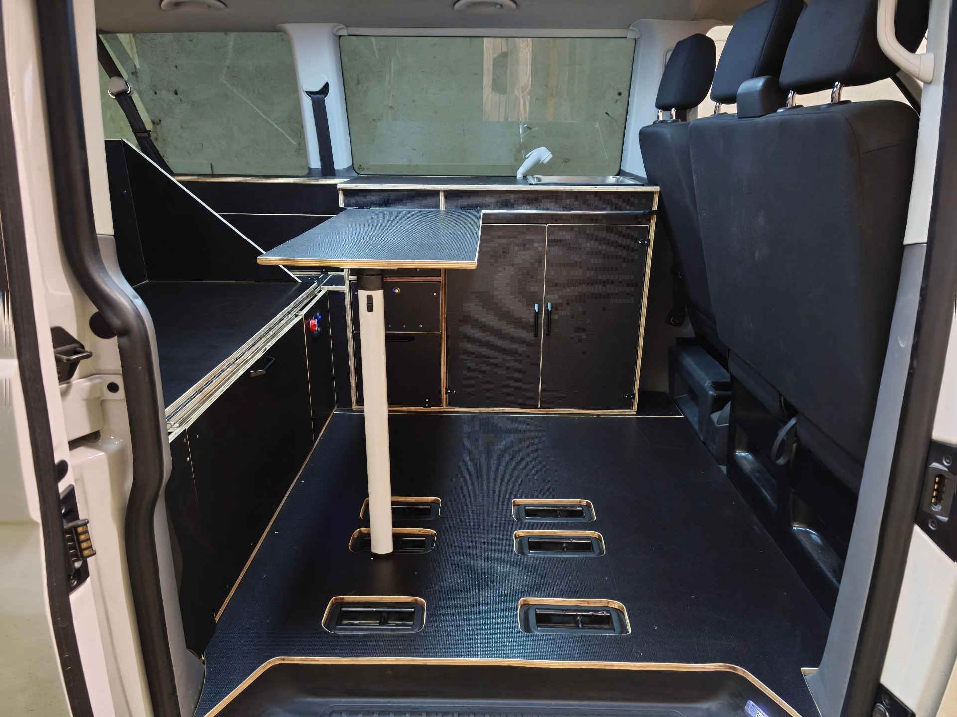 En la zona central se crea un pequeño salón interior para furgoneta, con un sofá de 2 plazas y una mesa corredera abatible vinculada al mueble cocina independiente estilo VW California. Esto hace que la furgoneta no sea solo un vehículo con cama, sino una solución mucho más cómoda para comer dentro, trabajar con el portátil o descansar resguardado cuando lo necesites.